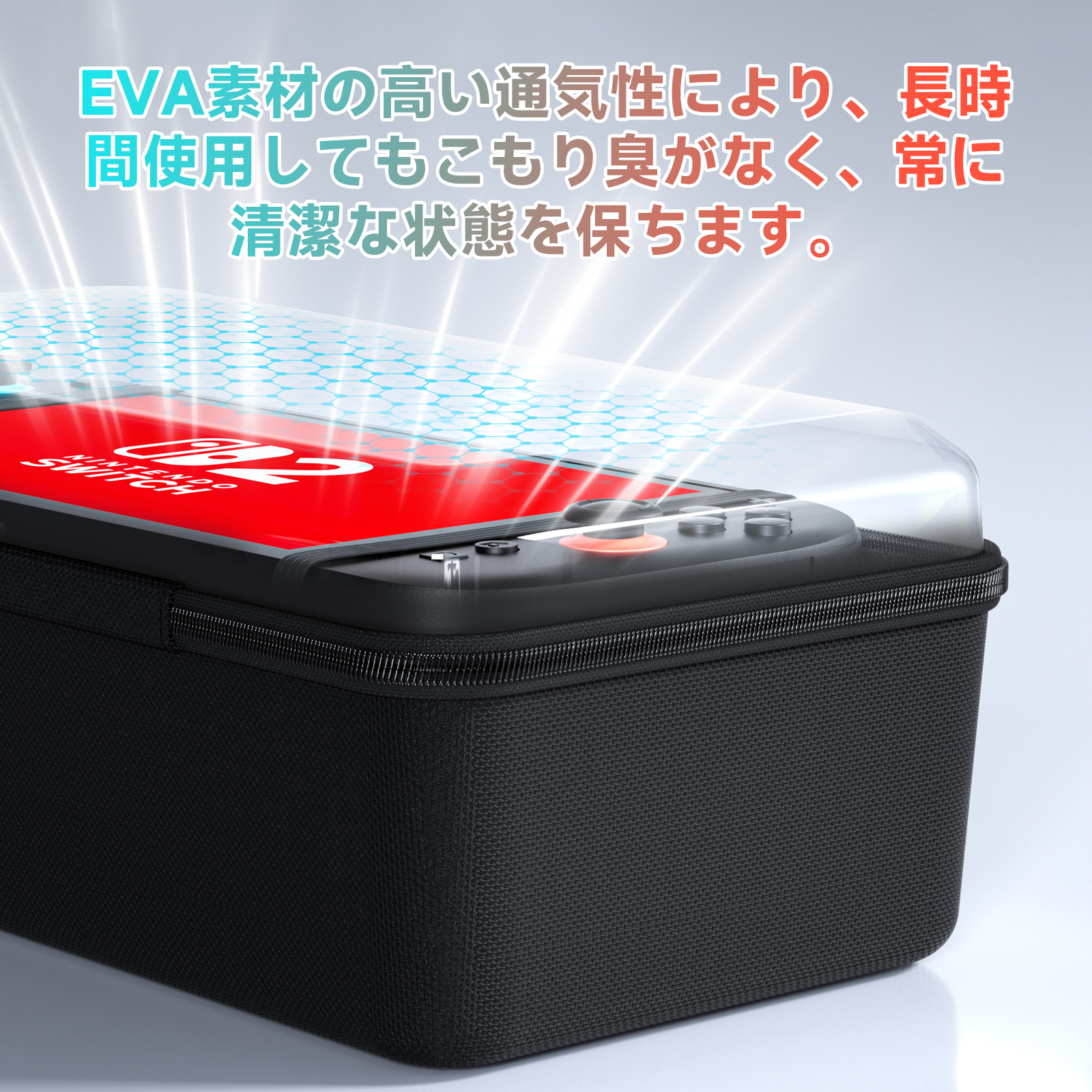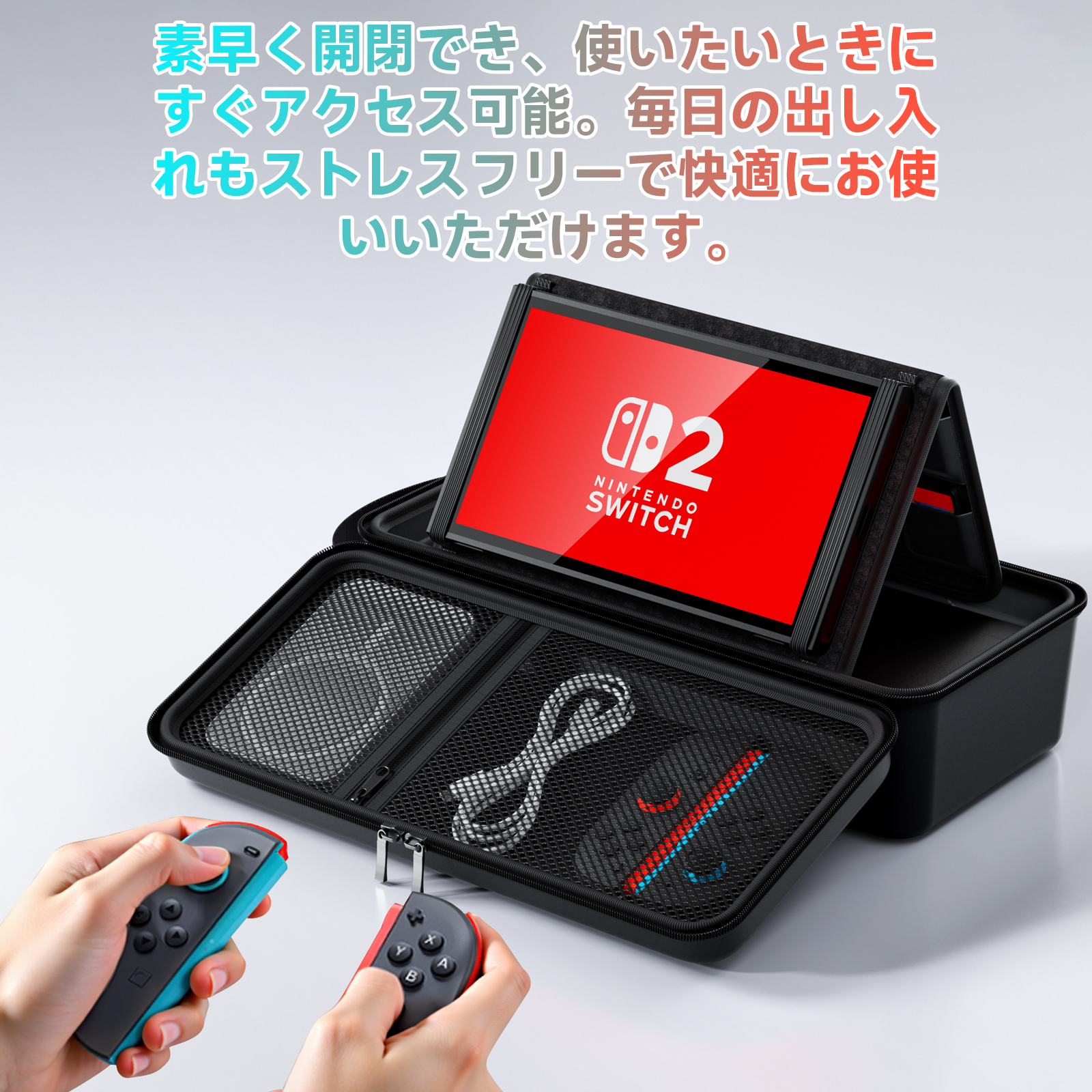 ★【上質な素材採用】Switch2収納バッグは上質なEVA素材を採用して、衝撃や擦り傷を防止でき、表面はPU張りで水に強く、汚れても湿った布で簡単に落とせます。内側は柔らかいクッション材を使用、本体固定用の伸縮性バンドもデザインの一つで、ゲーム機をしっかり固定され、落下対策になります