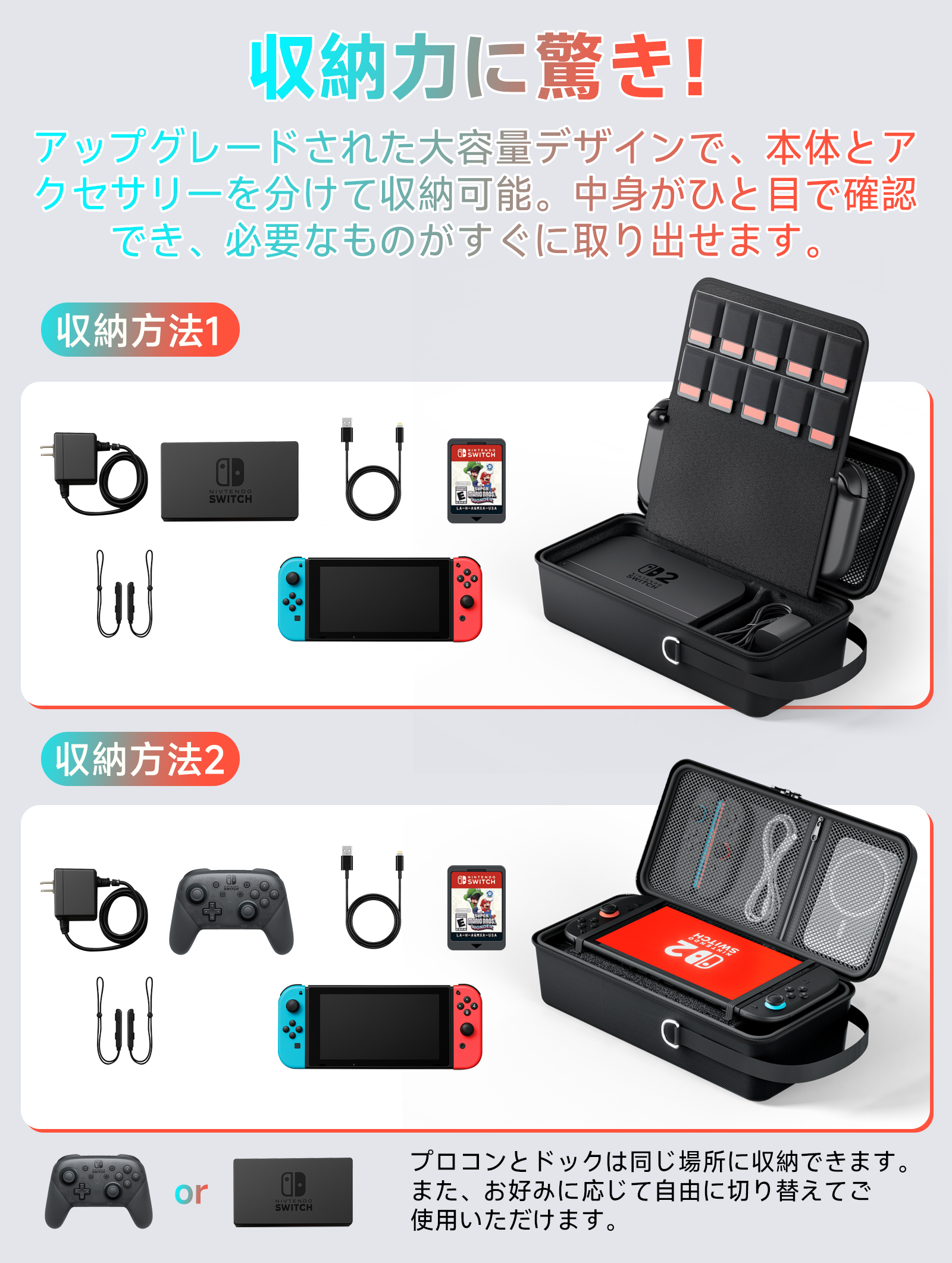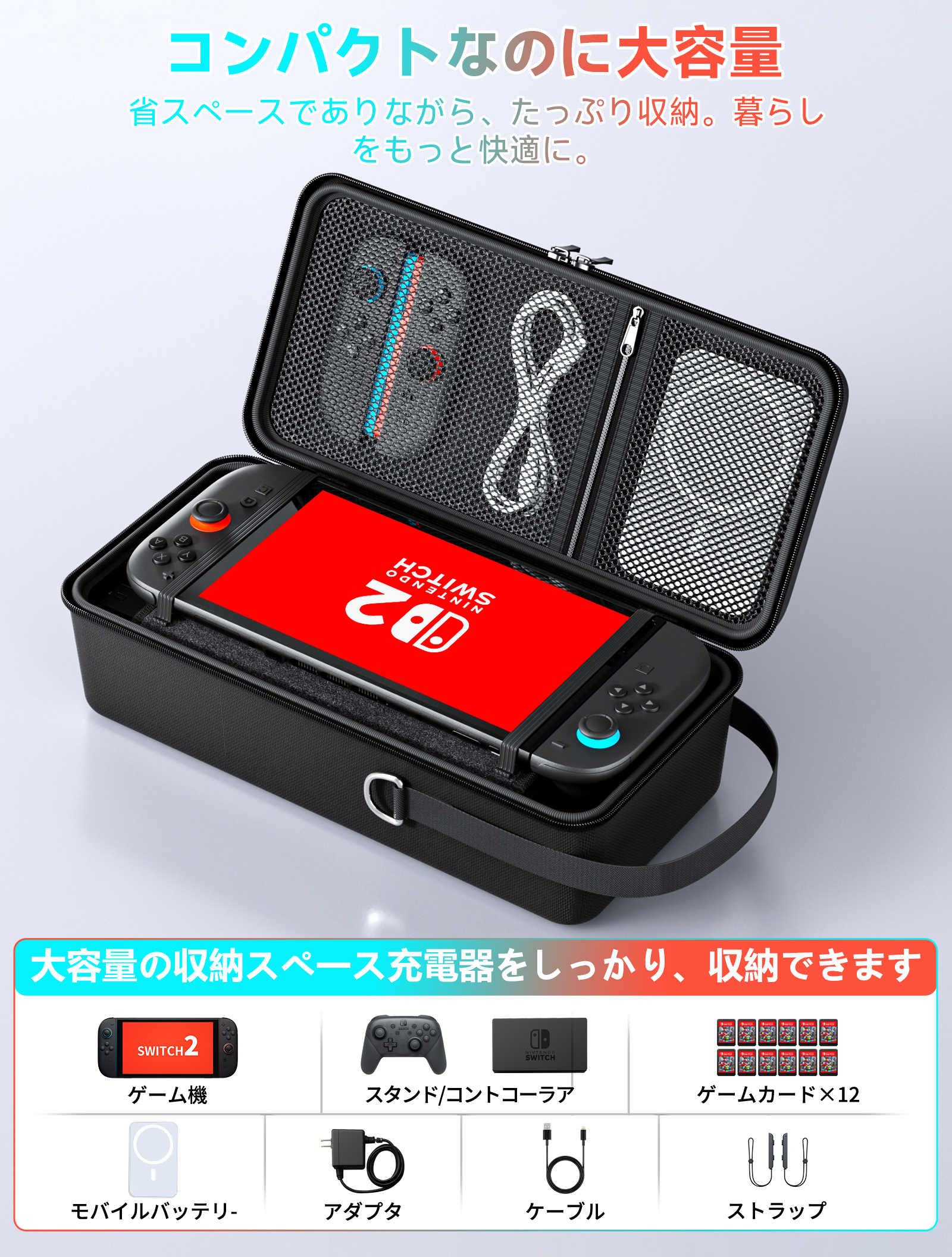★【大容量&抜群な収納力】スイッチ本体だけでなく、ゲーム機の付属品もすべて保存できること収納できます。ゲーム機本体はもちろん、Joy-Conも同時に収納でき、ゲームカードを入れます。ゲームカードは最大12枚が収納できます。 *注意:本品はSwitch2新型に対応します。
