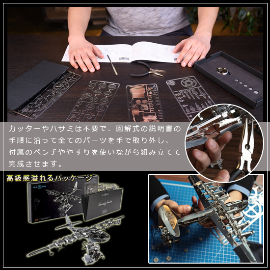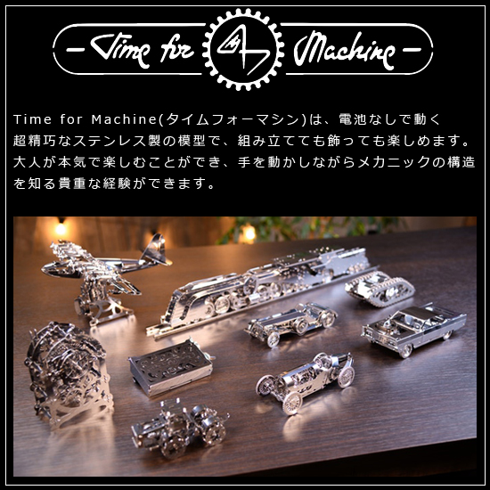 ●time for machine タイムフォーマシンは、メタルプレートを接着剤を使用せずに組み立てながら、スタイリッシュで精巧なステンレス製の模型を作ることが出来るメタル模型工作キットです。